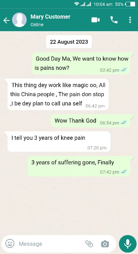 I could go on for pages with more examples. These are just few out of literally thousands of Nigerians who have experienced exactly what the potency of the herbs in the patch and knee brace can do for them.
